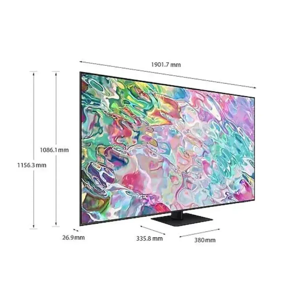 The dimensions of the Samsung 85 Inch QLED 4K Smart TV are H 1156.3mm x W 1901.7mm x D 335.8mm. This Samsung TV has a 2-year guarantee.