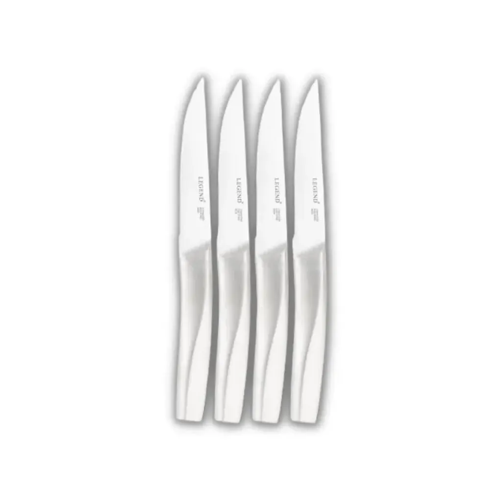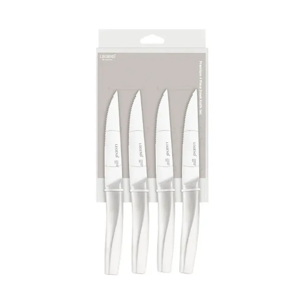 The Legend Classic 4 Piece Steak Knife Set consists of four steak knives that are made using quality surgical steel. With an ergonomic handle shape and serrated blade, these knives can be used to cut up a range of food items. read more ↓ read less ↑