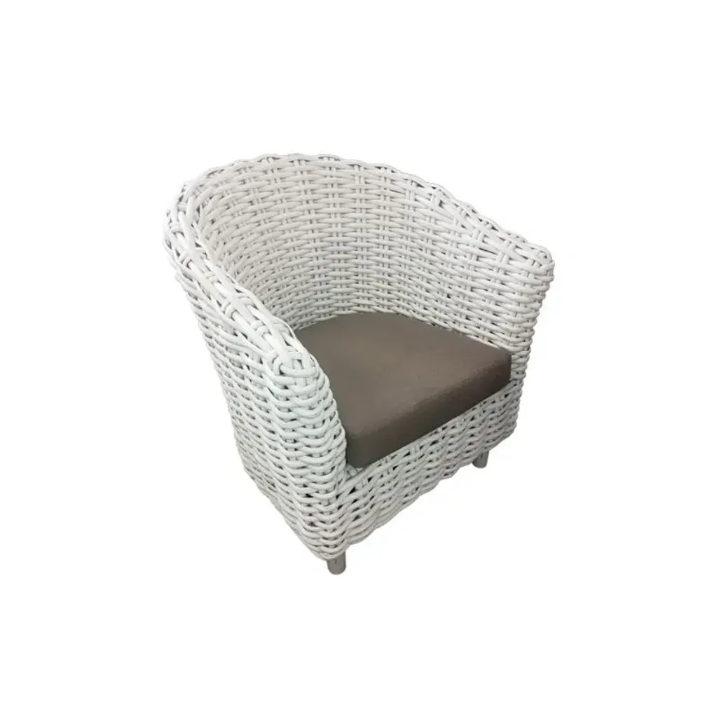 The Congo Occasional Chair has a distressed white rattan frame and a cushion, for additional comfort. Rattan wood is lightweight, making it easy to move the chair.