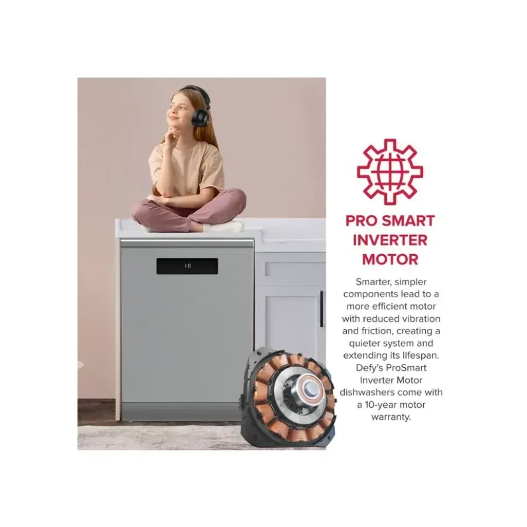 The Defy 15 Place Inox CornerWash Dishwasher has an A+++ energy rating, 7L water consumption, 8 programs, and 44DB noise level. With the help of Defy CornerWash Technology, there are three spray arms, to ensure your dishes, and glasses are spotless. read more ↓ read less ↑