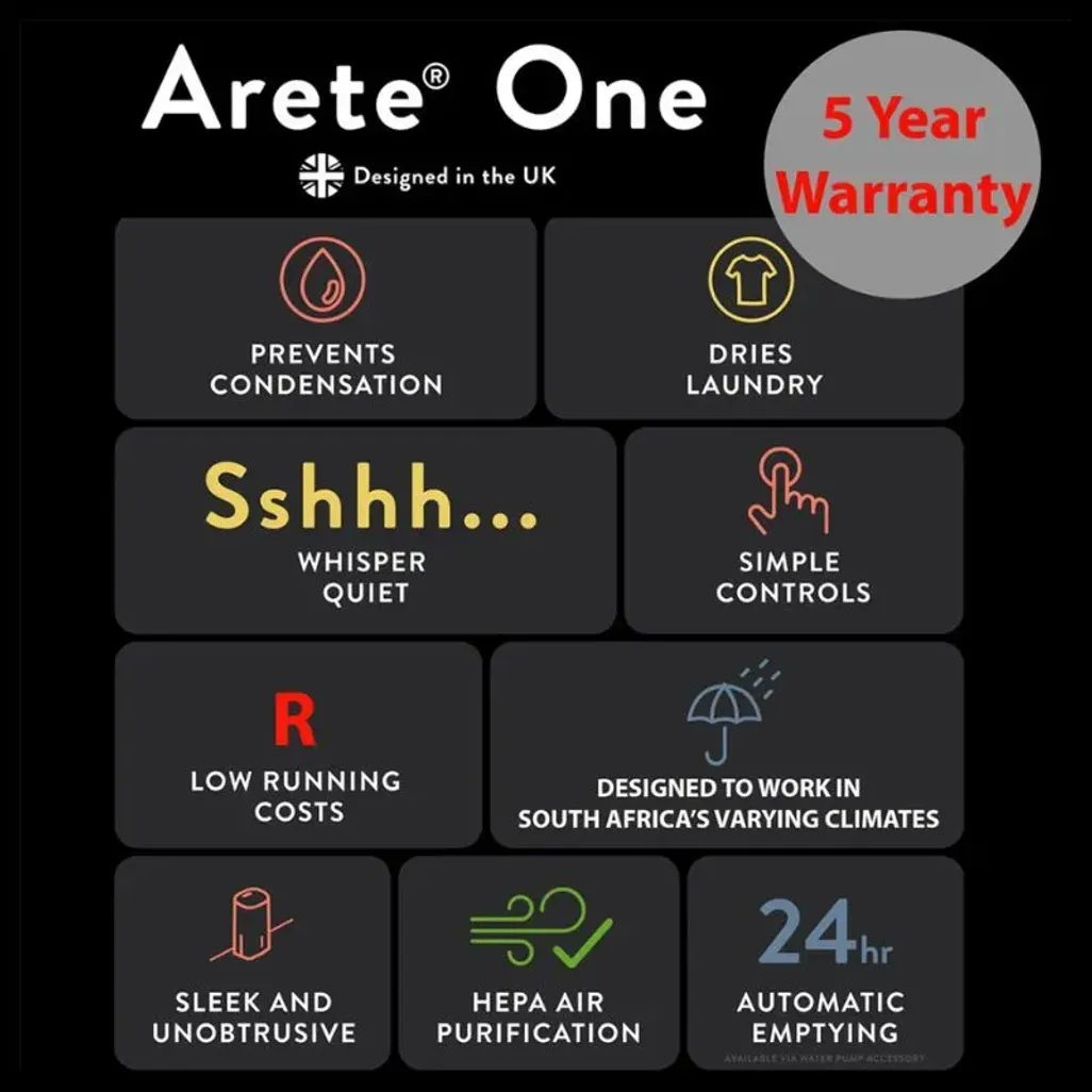 The dimensions of the Meaco Arete 12L Dehumidifier are H 319mm x W 237mm x D 472mm, and the dehumidifier is backed by a free 5-year part and labour warranty.
