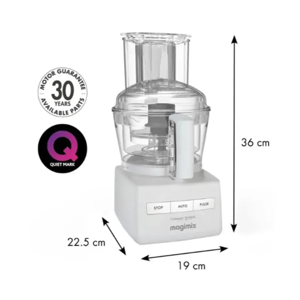 The dimensions of the Magimix 3200XL Food Processor are H 360mm x W 190mm x D 225mm. There is a 3-year guarantee on the parts, and a 30-year guarantee on the motor, provided that it is used for domestic use only.