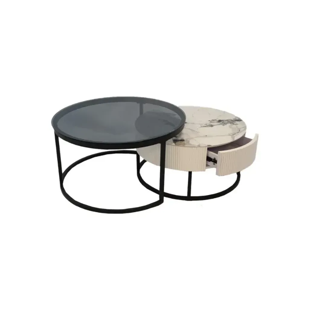 The Harriet 2 Piece Coffee Table Set consists of two coffee tables, one with a metal frame and tempered glass top, and another table with a ceramic top, and there is a drawer, that can be used for additional storage.