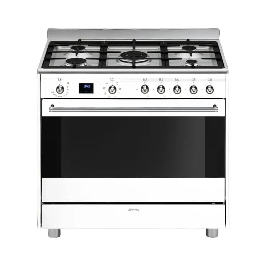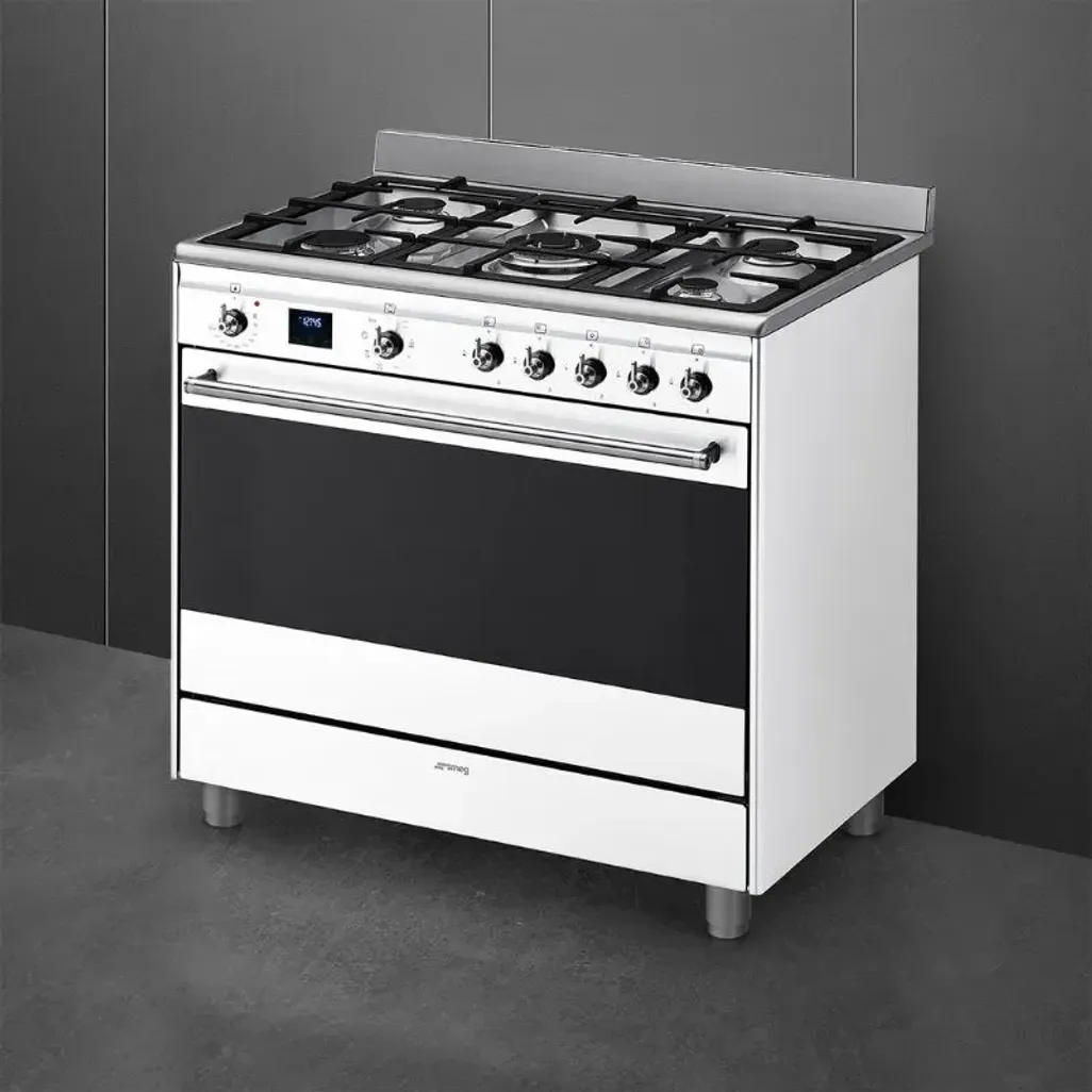 The Smeg 90cm Glossy White Gas / Electric Cooker consists of a five-burner gas hob, with heavy-duty cast iron pan supports, and there is a 115L electric oven, with a triple glass door and halogen light.