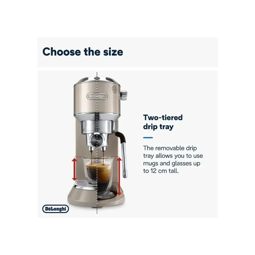 The Delonghi Dedica Arte Beige Pump Espresso Coffee Maker comes with the Delonghi standard of quality as well as the machine with its attached LatteArt steam wand, a milk jug, Pro tamper, Ese filter, 3 easy clean single - double filters and a descaler.