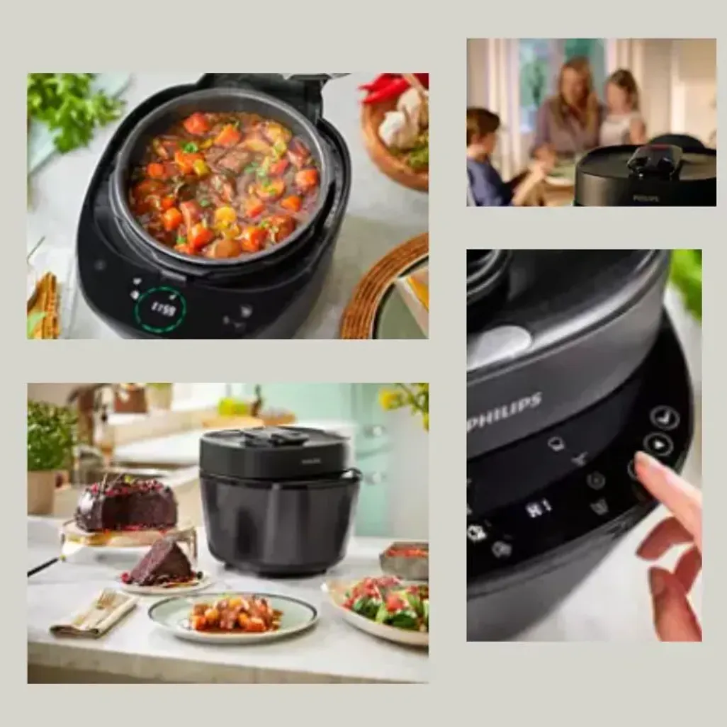 Get your meals prepared easily and on the table in minutes, not hours with the Philips All-In-One Pressurized 5L Cooker with 50% faster cooking than stovetop cooking. This all-in-one cooker takes the hassle out of home cooking with its 18 Protection Systems which promotes worry-free cooking, with Pre-Set cooking programs like slow cooking, sautéing and steaming, there are 35 pre-set options to choose from. The Rapid Pressure Release Technology delivers automatic pressure to reduce cooking time as well Auto Pressure Release function which automatically releases pressure once cooking is finished. You can easily adjust cooking lengths and pressure cooking levels, and the Philips All-In-One Pressurized 5L Cooker has a preset timer and a keep warm function for those days when you have your meal ready but the family is not ready to eat yet. With Step-by-step guidance for easy operation and the NutriU app for everyday meal support and inspiration, the Philips All-In-One Pressurized 5L Cooker is all you need in your kitchen.