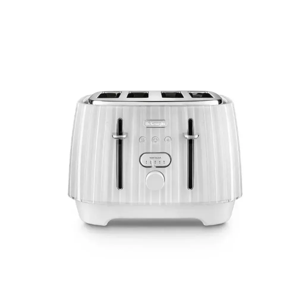 Powered by 1800W, this Delonghi Ballerina 4 Slice White Toaster is not only a visual delight but also a powerful addition to your kitchen. The elegant translucent plastic processing paired with metal-wrapped touch points, creates an aesthetic of modern sophistication.