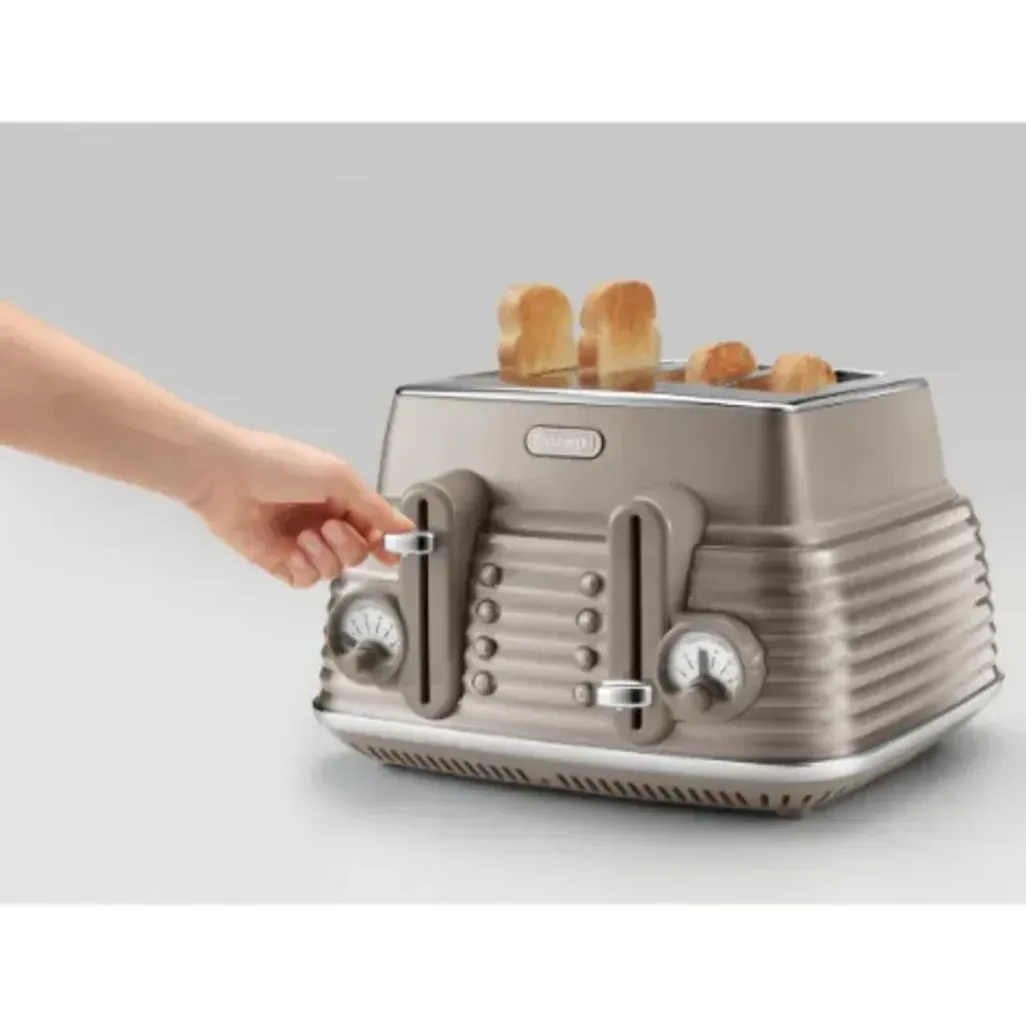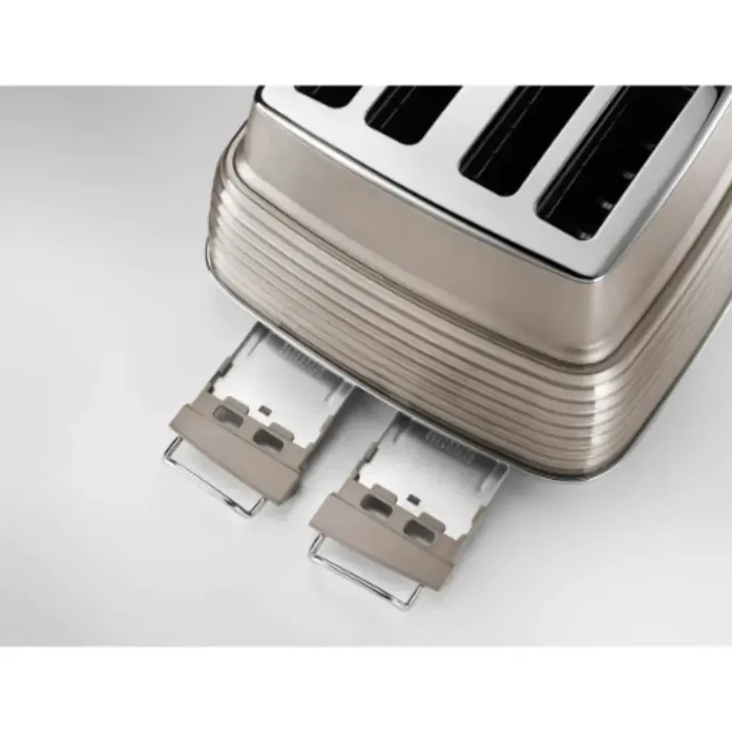 The Delonghi Scultura 4 Slice Clay Beige Toaster has 2 crust trays that can easily be removed in order to clean the bottom of the 4-slice toaster and prevent hazardous build-up inside the toaster.