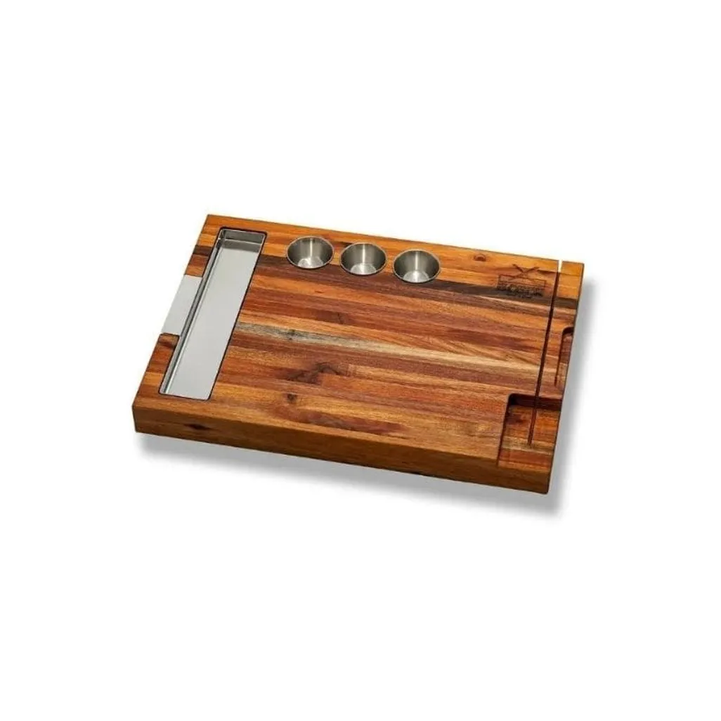 - Side one - Is the perfect preparation board as it has space for all your chopping needs. It is a removable prep holder, along with three removable spice holders. In addition, there is a secure knife slot for knife safety and storage is another clever touch to the highly functional design.